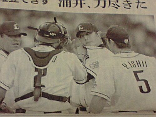関係ないんですけど、今朝の朝日に打たれた西武涌井のマウンドに内野陣が集まる写真が出てて、これって涌井が自分の右手でユニの襟元を掴んで汗を拭いてるだけなんですが、捕手炭谷の腕の微妙な角度とあいまって、なんかすごい「炭谷に襟首をつかんで持ち上…
